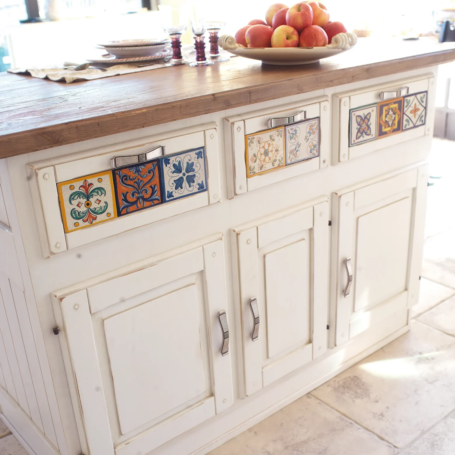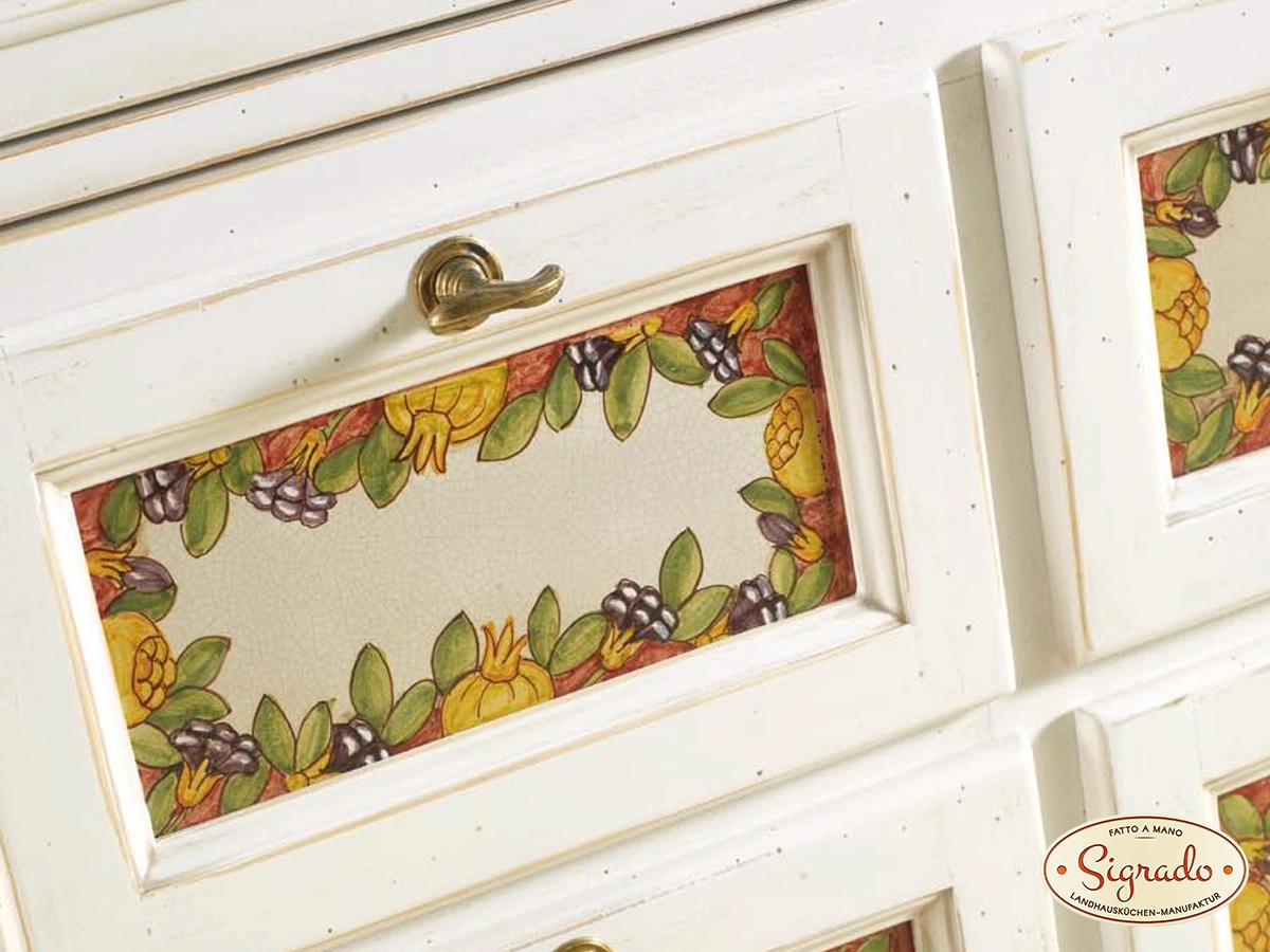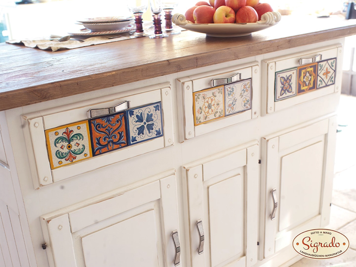 Handbemalte Fliesen verleihen der mediterranen Finca Küche eine besondere Note – je nach Gestaltung als ausdrucksstarkes Highlight oder als dezente Poesie im Hintergrund. Farben und Motive entstehen nach Wunsch: kräftige mediterrane Töne mit Ornamenten und Mustern, die sofort ins Auge fallen, oder zurückhaltende, feine Dekore, die sich harmonisch in Holz und Naturstein einfügen. So wird jede Küche individuell geprägt – mal mit einem markanten Blickfang, mal mit subtiler Eleganz, aber immer mit persönlicher Handschrift.